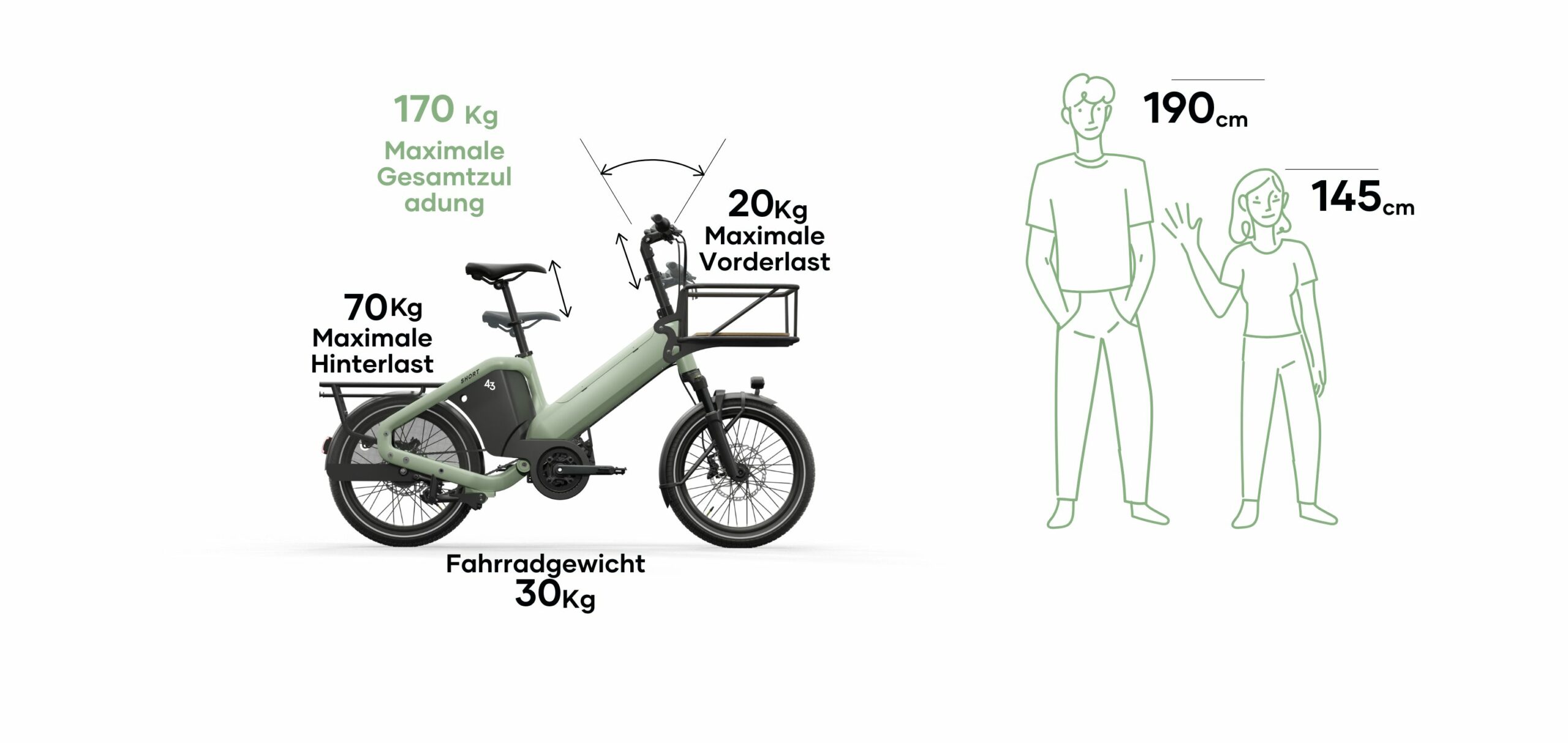 Die Füße des vorderen Kindes sind unter dem Sattel vor den Pedalen geschützt. Eine clevere Lösung, die das Bike 15 cm kompakter und sicherer macht.